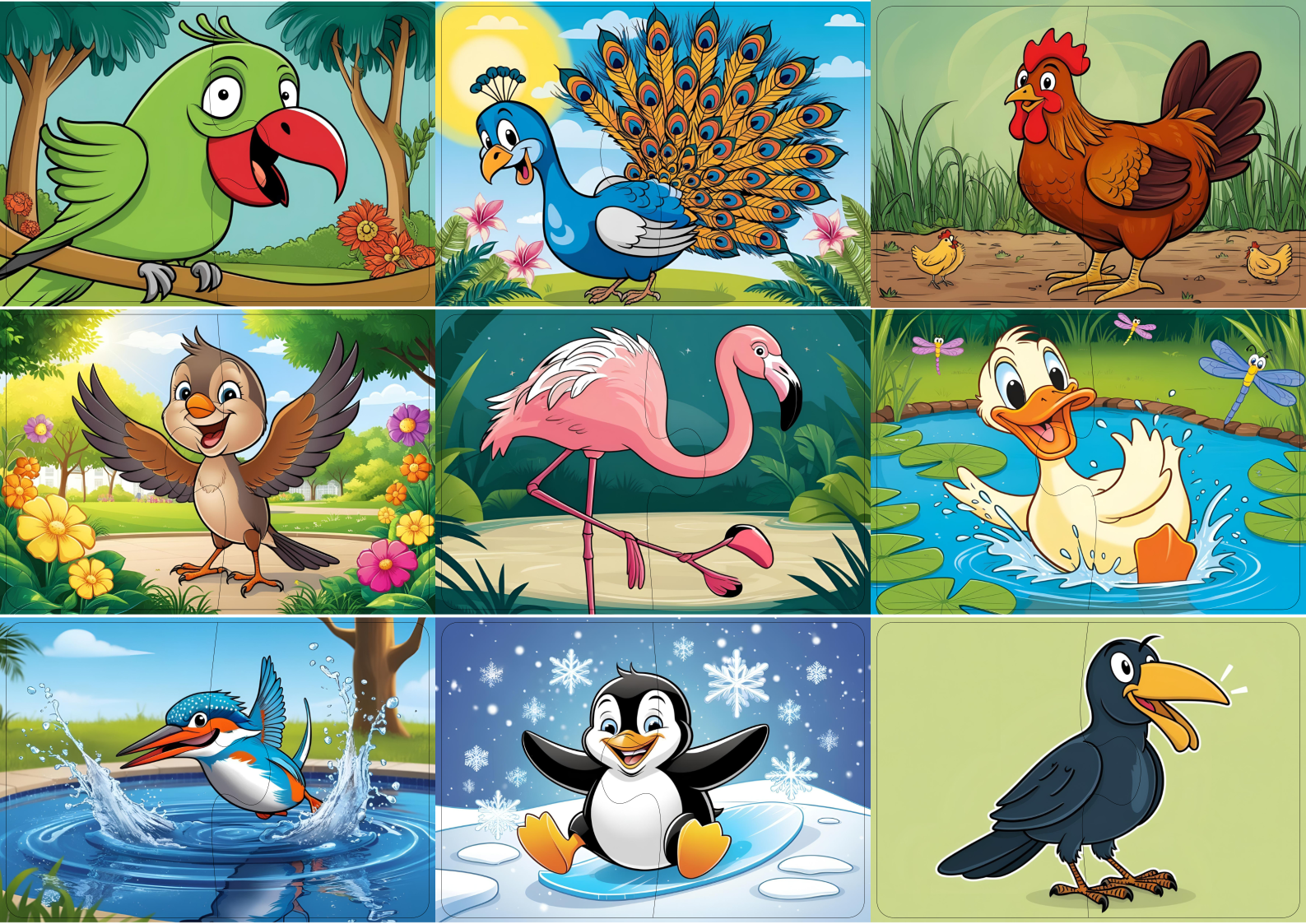 A total of 9 separate 2-piece puzzles, featuring a delightful menagerie of birds!